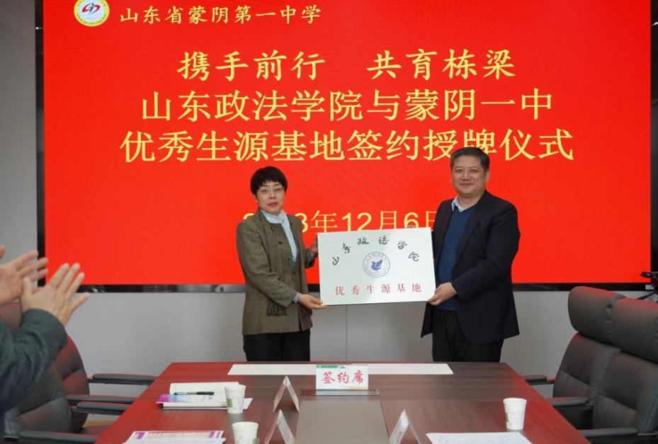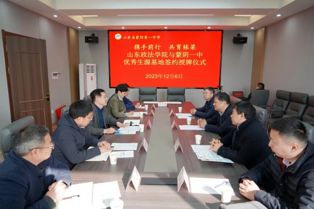 12月6日上午,山东政法学院优秀生源基地授牌签约仪式在山东省蒙阴县第一中学举行。山东政法学院党委委员、副校长蒋海升,蒙阴一中党委书记李祥勇、副校长戚建芬,网络空间安全学院院长殷立峰、副院长常旭,学校招生就业处邓立志与蒙阴一中有关领导参加仪式。