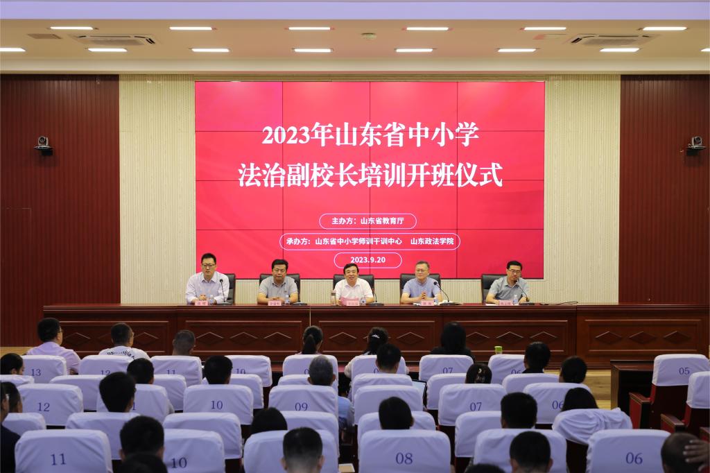 9月20日上午, 2023年山东省中小学法治副校长培训开班仪式在知行楼庭审直播室举行。学校党委委员、副校长窦衍瑞,山东省中小学师训干训中心培训部主任路海,继续教育学院、民商法学院相关负责同志及培训班全体参训学员出席仪式。窦衍瑞以“深学细悟二十大报告精神 贯彻落实习近平法治思想”为题为参训学员讲授第一课。