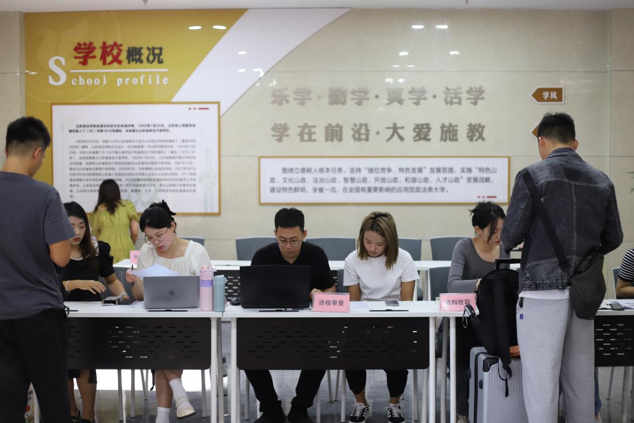 记录新起点,开启新故事。新生们纷纷在签名墙前合影留念,留下与山政相遇的第一张照片,感受着学校的期待与家长的嘱托,心怀崇德明法的志向,更加笃定了成为山政人的初心。2023级非法学1班邱皓楠同学表示:“很幸运可以在山政开启新的学习生活,希望在新的学期能够认真学习,跟同学们和谐相处,跟随导师研究学术,努力提升自己!”