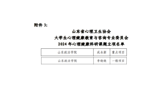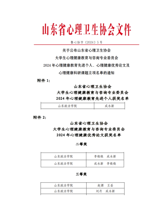 5月16-17日,山东省心理卫生协会大学生心理健康教育与咨询专业委员会2024年年会在山东建筑大学召开。会议对2024年心理健康教育先进个人、心理健康优秀论文及心理健康科研课题立项进行了表彰,山东政法学院教师在多个项目中获奖。其中,获评“2024年心理健康教育工作先进个人”荣誉称号1人,获得心理健康优秀论文二等奖和三等奖各2项,获得科研课题立项重点项目和一般项目各1项。