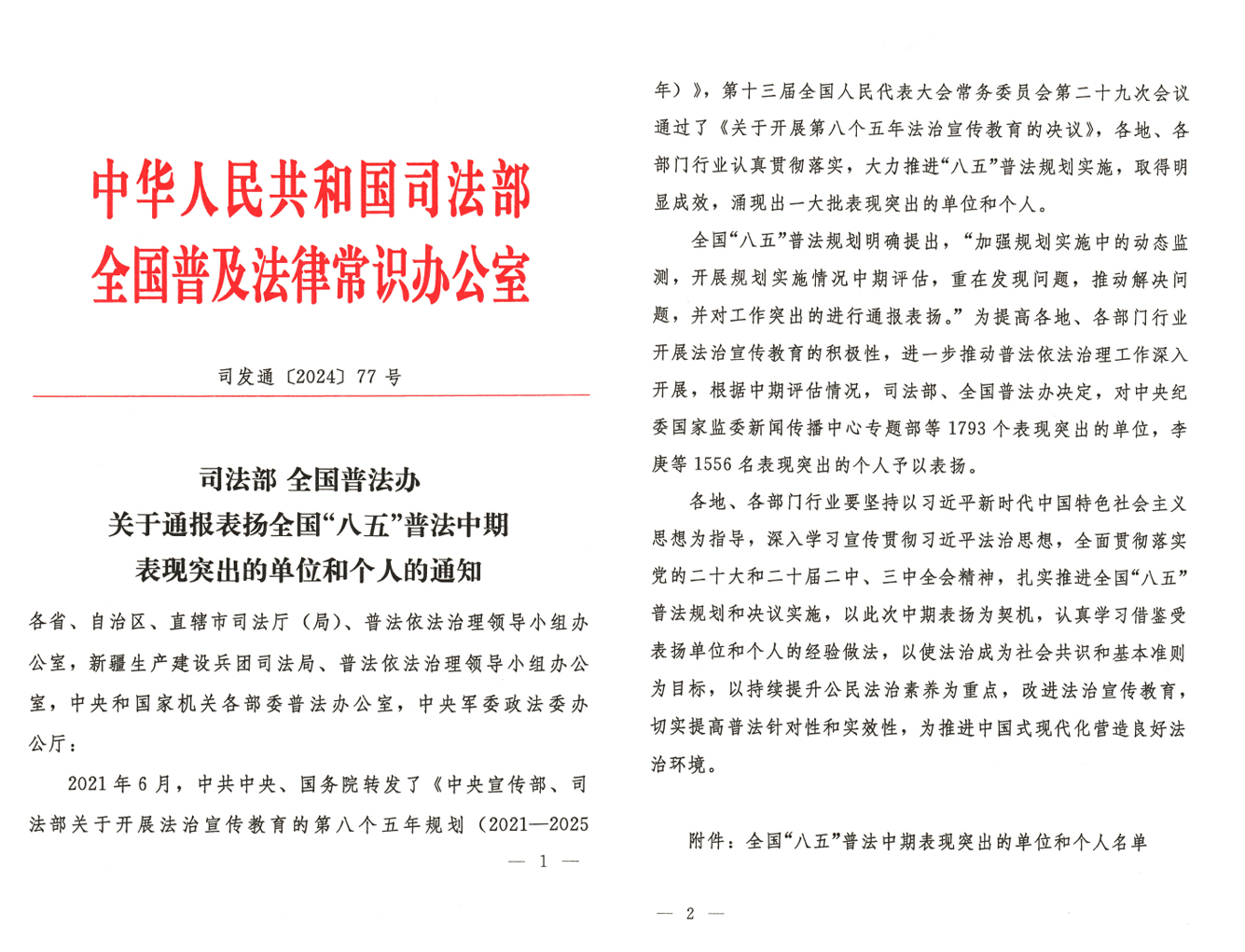 近日,司法部、全国普法办印发通知,对全国“八五”普法中期表现突出的单位和个人予以通报表扬,山东政法学院法律事务办公室获评全国“八五”普法中期表现突出单位。