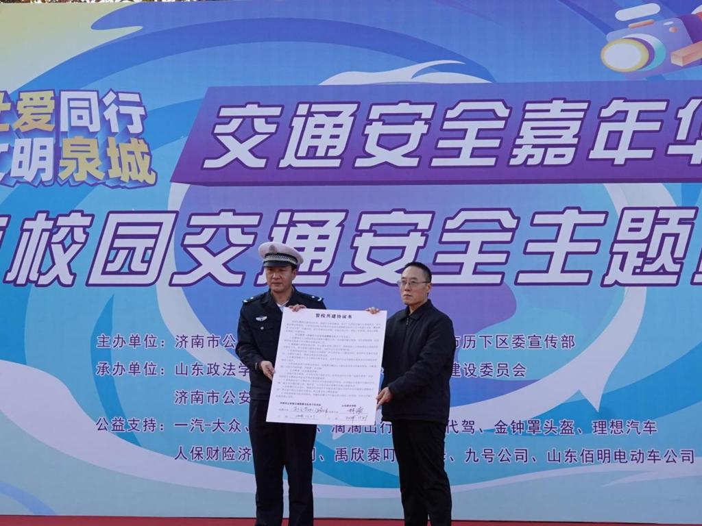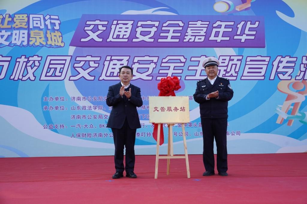 济南市交警支队政委黄强与山东政法学院校长王效彤共同为“交管服务站”揭牌。历下区交警大队大队长任家伟与山东政法学院副校长林爽共同签署了《警校共建协议书》。