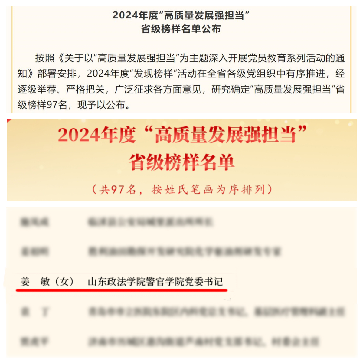 12月6日,中共山东省委组织部公布2024年度“高质量发展强担当”省级榜样名单。警官学院党委书记姜敏入选榜样名单。