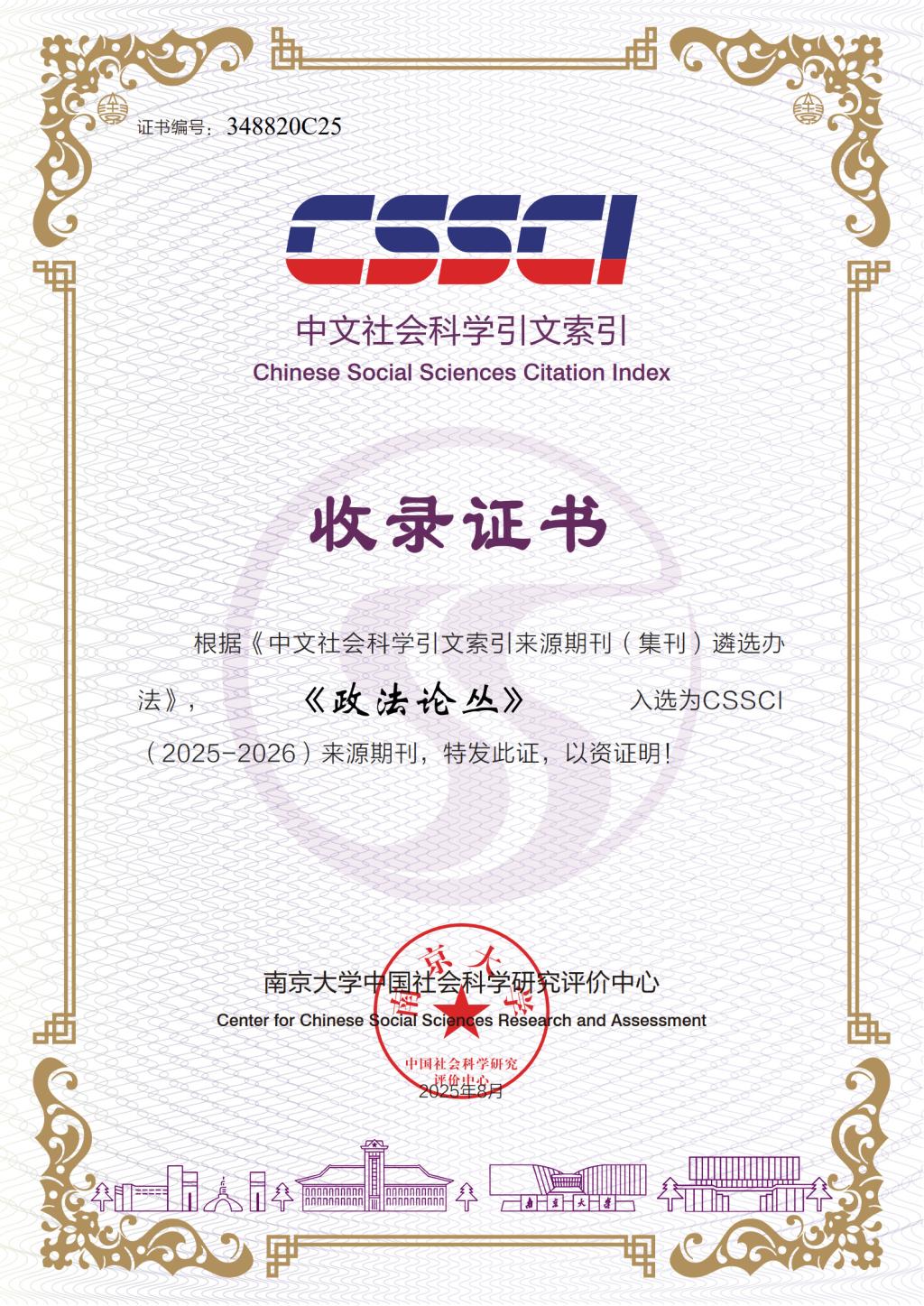 近日,山东政法学院《政法论丛》收到由南京大学中国社会科学研究评价中心发放的中文社会科学引文索引(CSSCI)收录证书,《政法论丛》凭借卓越的学术品质和广泛的社会影响力继续成功入选新一届CSSCI来源期刊。