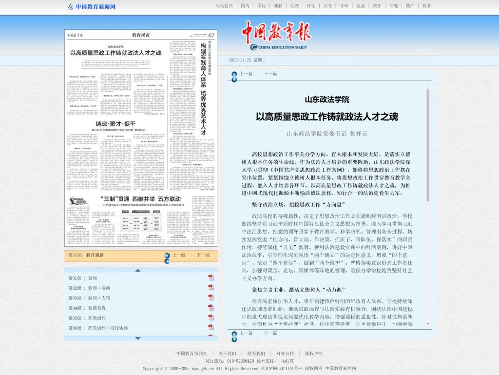 11月25日出版的《中国教育报》第07版(教育视窗)刊发了党委书记张祥云署名文章《以高质量思政工作铸就政法人才之魂》。