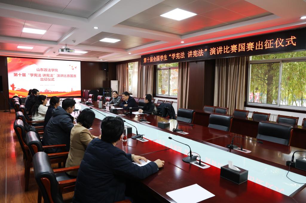 11月26日,第十届“学宪法 讲宪法”演讲比赛国赛出征仪式在鼎山楼第二会议室举行。学校党委委员、副院长蒋海升出席仪式并讲话,经济贸易法学院、警官学院相关领导、指导教师及参赛选手参加仪式。仪式由校团委书记贾俊涛主持。