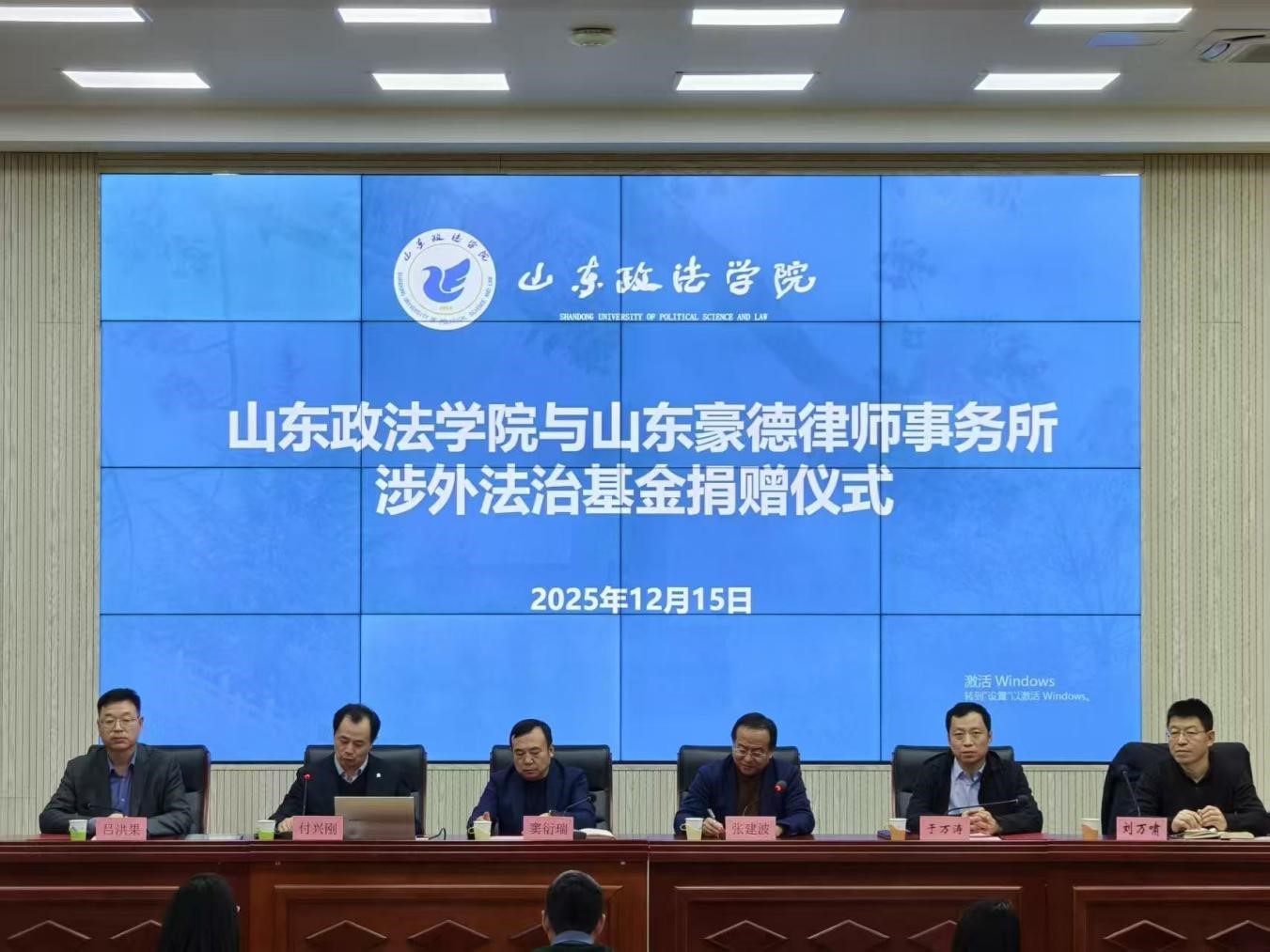 12月15日,山东政法学院与山东豪德律师事务所涉外法治基金捐赠仪式在学校知行楼报告厅举行。山东政法学院党委委员、副院长窦衍瑞,山东豪德律师事务所主任付兴刚出席仪式并致辞。经济贸易法学院党委书记于万涛、院长刘万啸及班子成员,山东豪德律师事务所副主任吕洪果及律师代表等参加活动。捐赠仪式由发展规划处处长张建波主持。