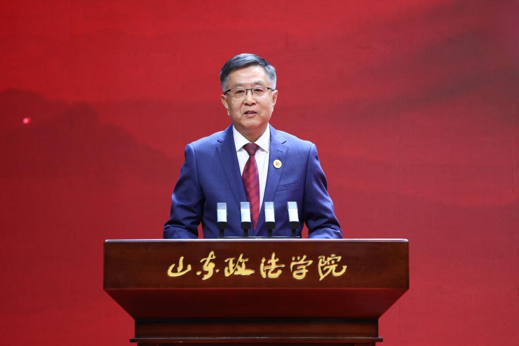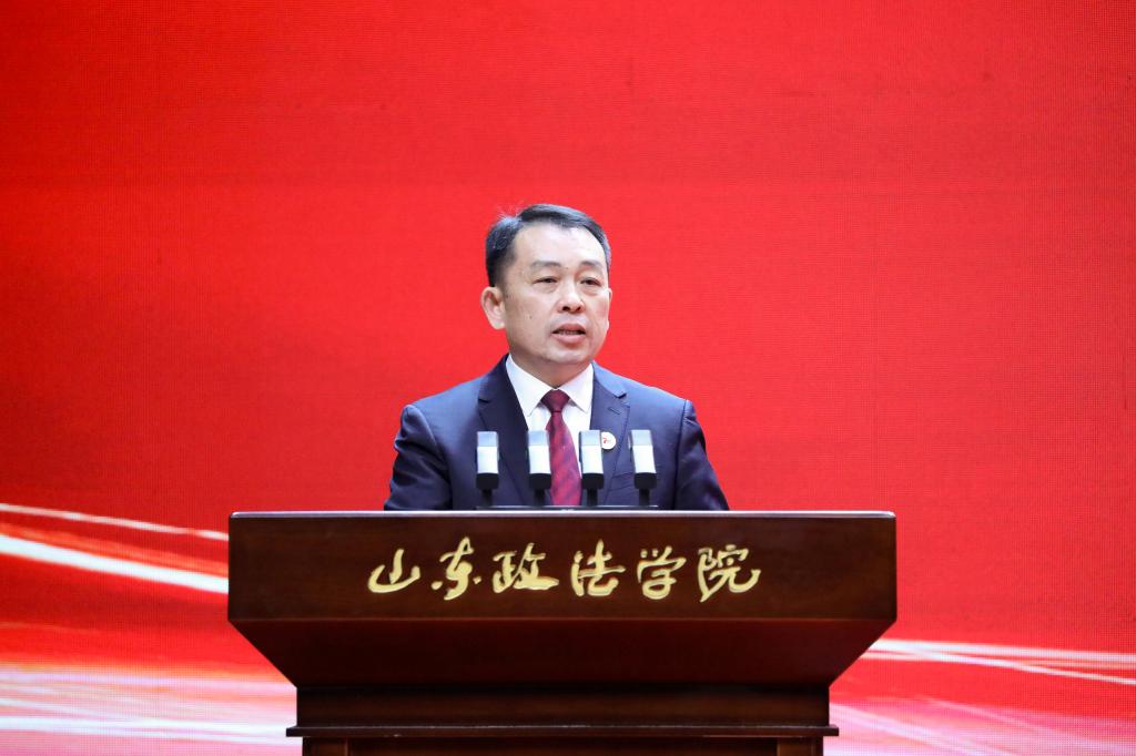 山东省副省长陈平讲话。他代表省政府向山东政法学院建校70周年表示热烈祝贺。陈平充分肯定了学校七十年来在人才培养、科学研究、社会服务等方面,特别是服务法治山东建设方面取得的显著成效。他指出,当前山东高等教育正处在筑峰起势的关键时期,省委、省政府将全力为高校创新发展营造良好环境。山东政法学院要牢牢把握发展机遇,自觉将自身发展融入国家战略和山东实践,发扬特色优势、深化改革创新,努力为服务法治山东建设,助力山东高等教育事业发展贡献更大力量。他对学校未来发展提出四点希望:一要扛牢育人使命,努力培养堪当民族复兴重任的时代新人;二要深耕内涵特色,加快建设高质量办学体系;三要强化校地融合,聚力服务区域经济社会发展;四要深化改革创新,不断提升治理能力和治理水平。省委、省政府将一如既往支持山东政法学院的建设发展,助力学校在新时代高水平政法类大学建设征程上勇毅前行、再谱华章。