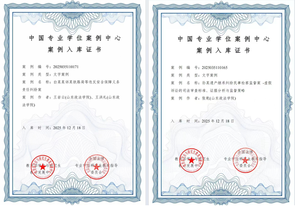 近日,全国法律专业学位研究生教育指导委员会发布通知,我校民商法学院张乾老师撰写的法律硕士教学案例《某遗产继承纠纷民事检察监督案》和王岩云、王洪礼两位老师合作完成的法律硕士教学案例《白某某诉某铁路局等违反安全保障义务责任纠纷案》,均被中国专业学位案例中心案例库正式收录入库,并获教育部学位与研究生教育发展中心及全国法律专业学位研究生教育指导委员会颁发的入库证书。