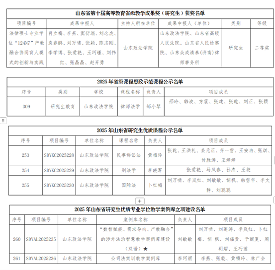 近日,山东省教育厅公布2025年研究生教育相关项目立项等情况,山东政法学院获评教学成果奖(研究生)二等奖1项、省级课程思政示范课程(研究生)1门,获批研究生优质课程立项3门、研究生优质专业学位教学案例库2项、研究生教育教学改革研究项目2项;获评山东省优秀硕士论文2篇、研究生创新成果奖1项。