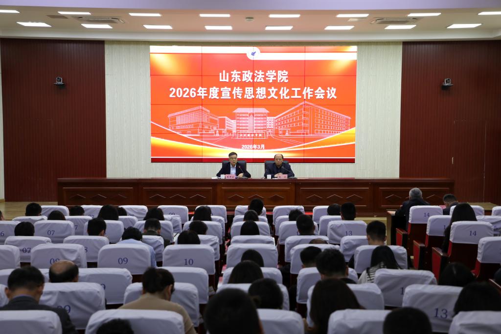 3月26日,山东政法学院在知行楼报告厅召开2026年度宣传思想文化工作会议。党委书记张祥云出席会议并讲话,代表学校党委与各部门单位签订《思想政治工作和意识形态工作责任书》。党委副书记赵斌通报了2025年度各二级党组织意识形态工作专项考核结果和2026年度意识形态工作要点。山东省宣传舆情研究中心主任田野应邀作专题辅导报告。会议由赵斌主持。