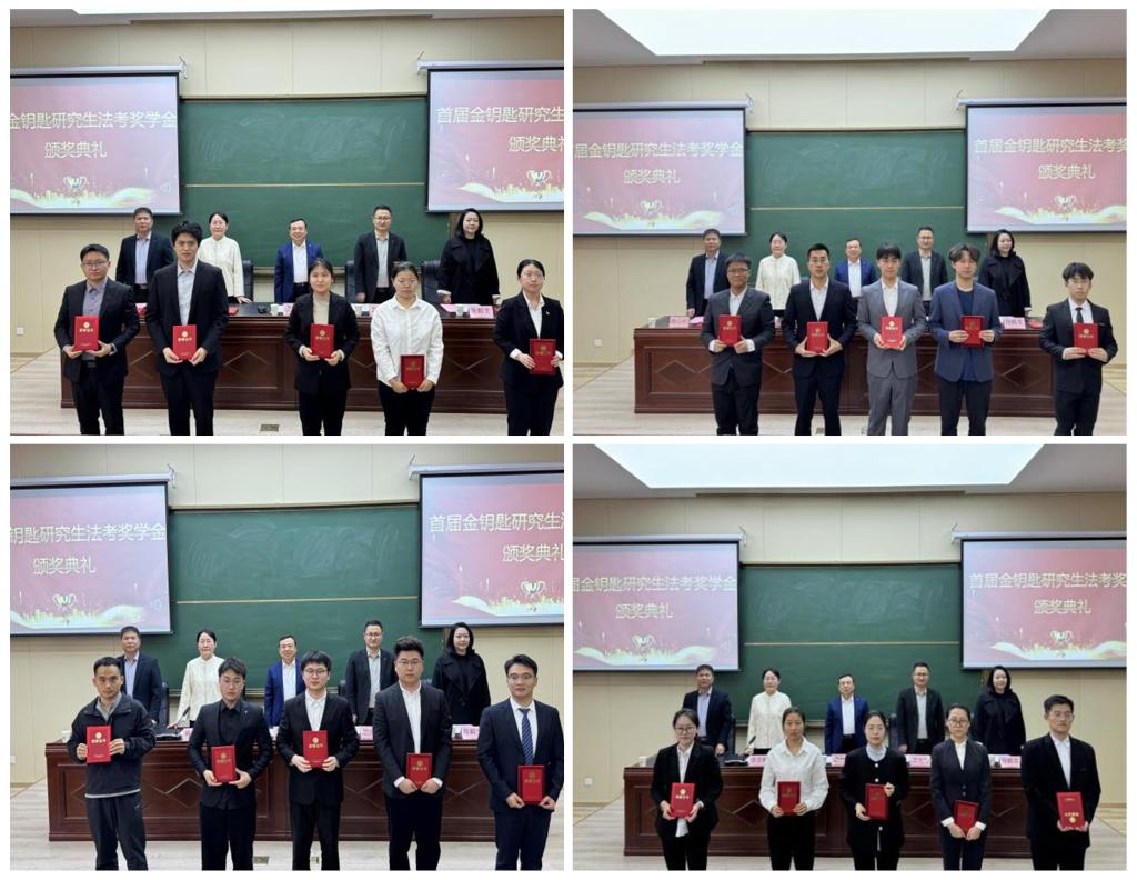 会上宣读了“首届金钥匙研究生法考奖学金”表彰决定,获奖同学依次上台领奖。2023级非法学2班霍延东同学作为获奖学生代表发言。