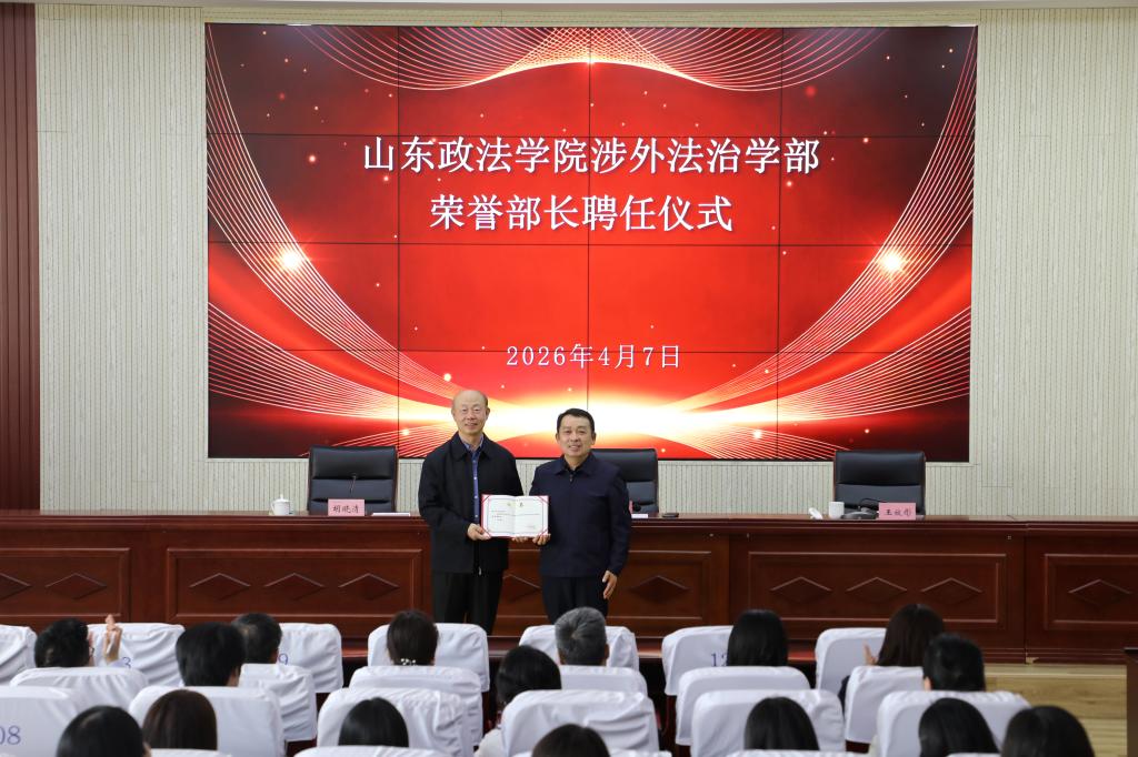4月7日下午,山东政法学院“涉外法治名家讲坛系列讲座·第一期”在知行楼报告厅举行。院长王效彤出席活动,并为海南大学副校长张法连教授颁发聘书,正式聘任其为涉外法治学部荣誉部长。学校党委委员、副院长胡晓清主持讲座。