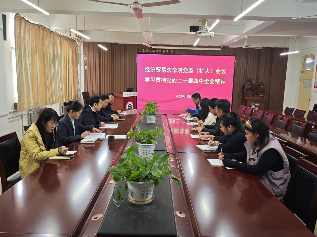 10月28日上午,经济贸易法学院召开党委(扩大)会议专题学习党的二十届四中全会精神。学院党委书记于万涛主持会议,学院班子成员、党委委员、党支部书记参加会议。