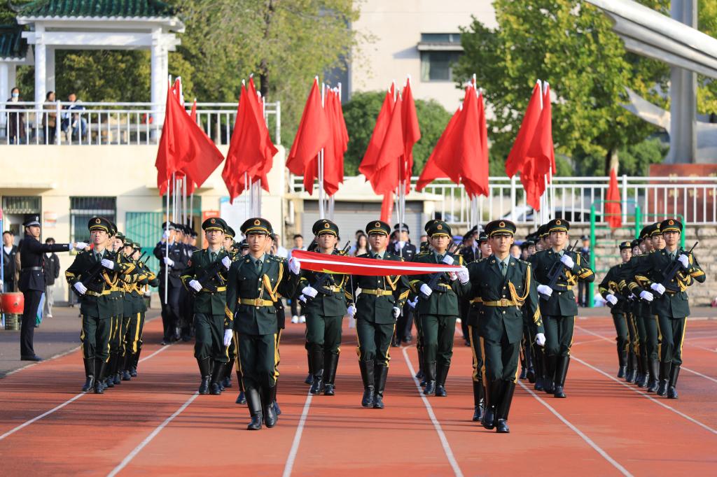 伴着庄严的国歌旋律,国旗手以标准姿势擎举国旗,迈着铿锵的正步,护送国旗走向主席台。全体师生肃立,向国旗行注目礼,齐唱国歌。